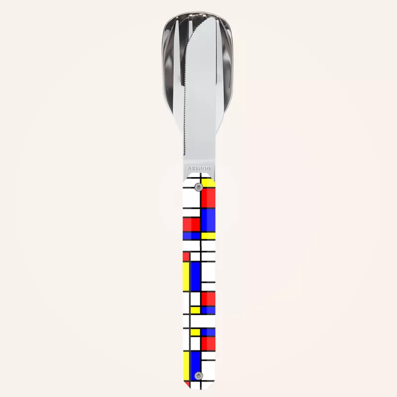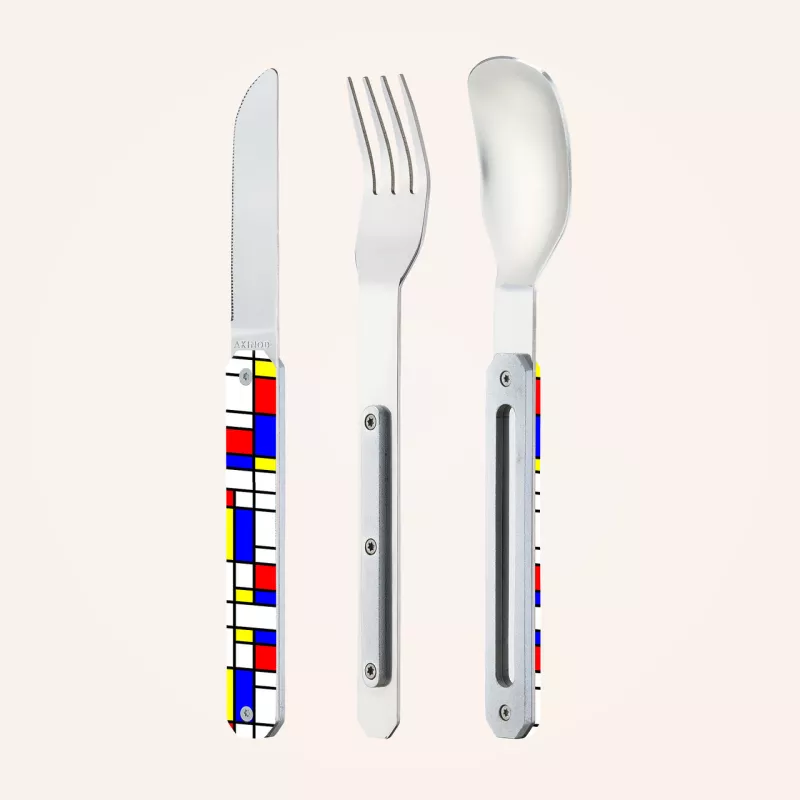 L’ensemble est composé d’une grande cuillère, d’une fourchette 4 dents et d’un couteau à lame micro dentée.