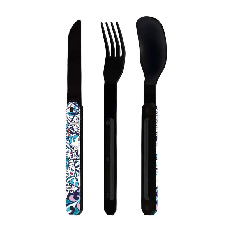 L’ensemble est composé d’une grande cuillère, d’une fourchette 4 dents et d’un couteau à lame micro dentée.