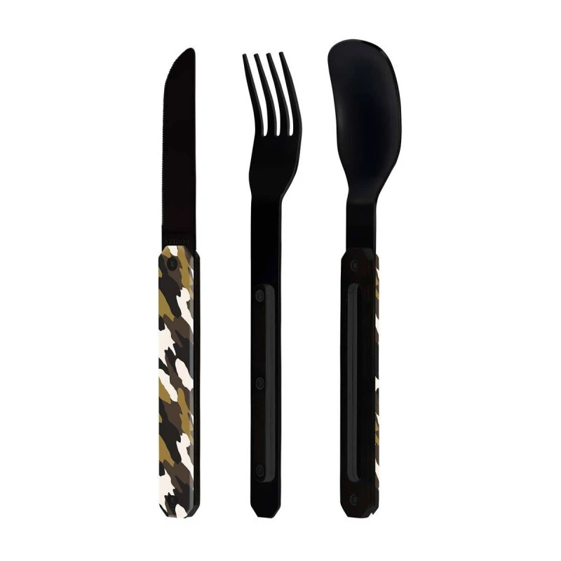 L’ensemble est composĂ© d’une grande cuillère, d’une fourchette 4 dents et d’un couteau Ă lame micro dentĂ©e.Â