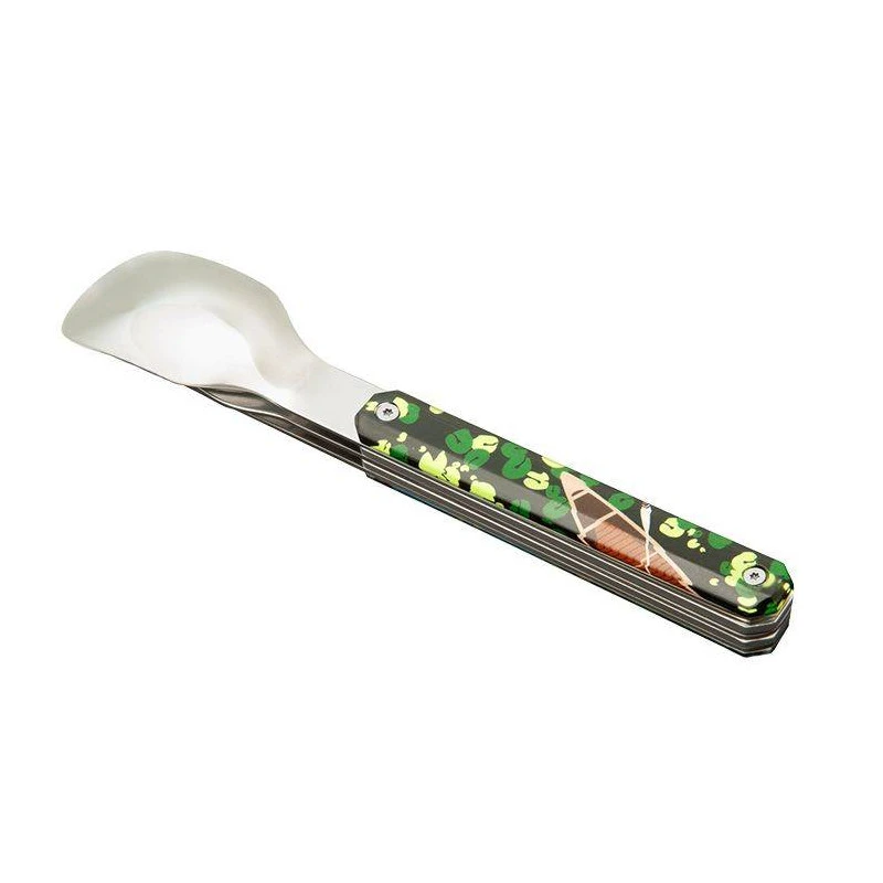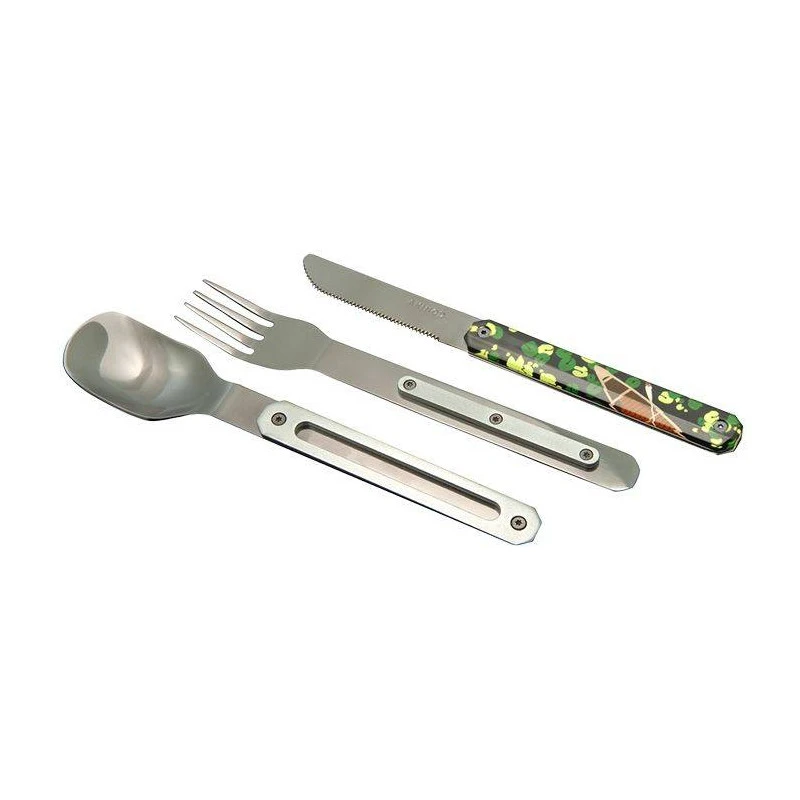 L’ensemble est composé d’une grande cuillère, d’une fourchette 4 dents et d’un couteau à lame micro dentée.