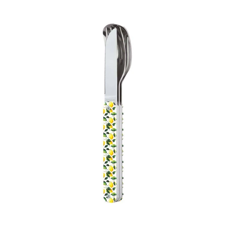 L’ensemble est composĂ© d’une grande cuillère, d’une fourchette 4 dents et d’un couteau Ă lame micro dentĂ©e.Â