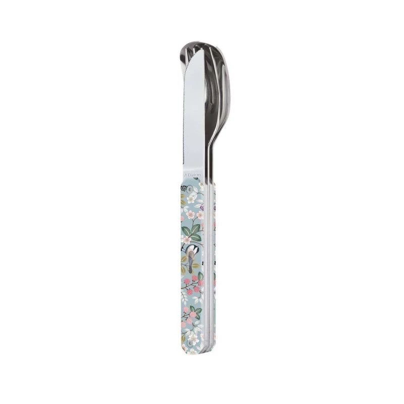 L’ensemble est composĂ© d’une grande cuillère, d’une fourchette 4 dents et d’un couteau Ă lame micro dentĂ©e.Â