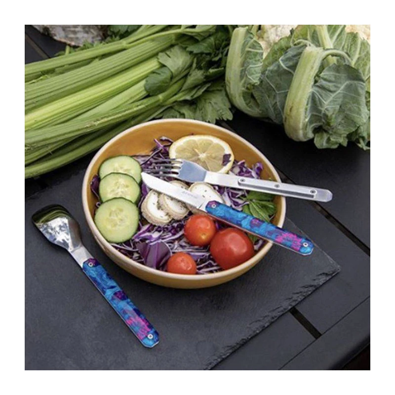 L’ensemble est composé d’une grande cuillère, d’une fourchette 4 dents et d’un couteau à lame micro dentée.