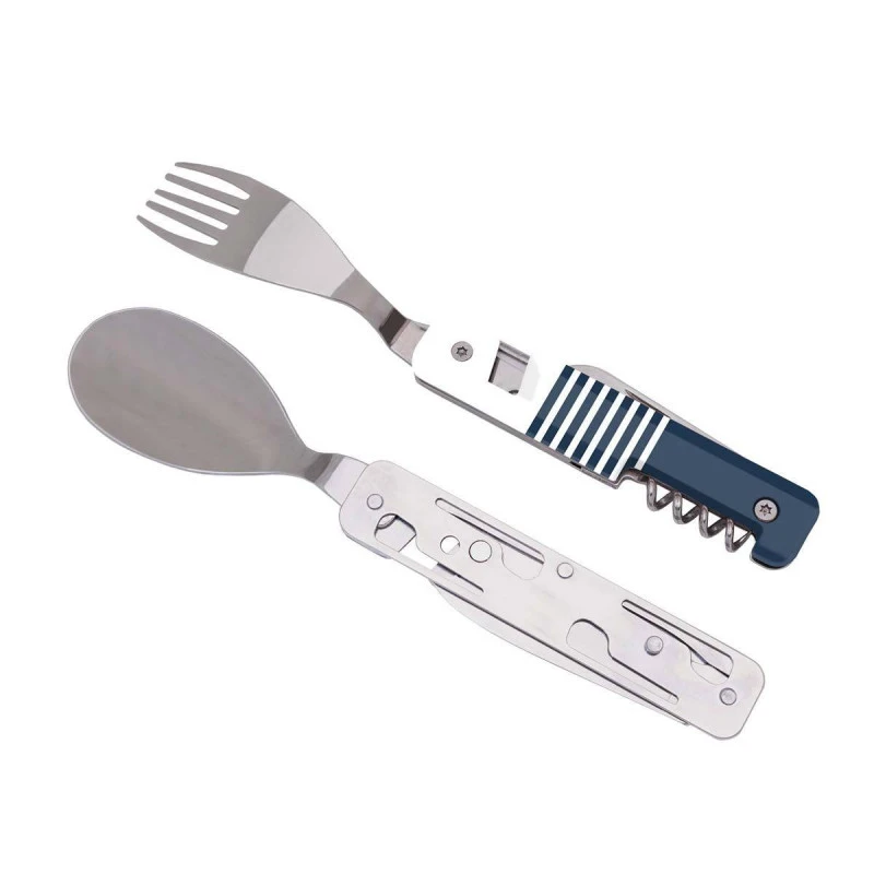 L’ensemble est composé d’une grande cuillère, d’une fourchette 4 dents, d’un couteau à lame micro dentée, d’un décapsuleur, d’un ouvre-boite et d’une tire-bouchon