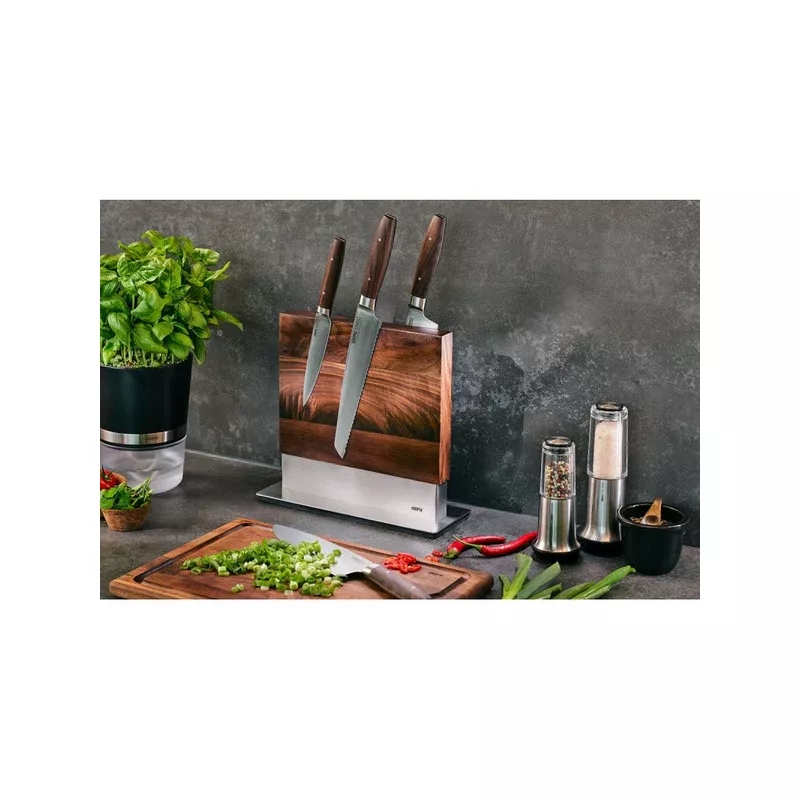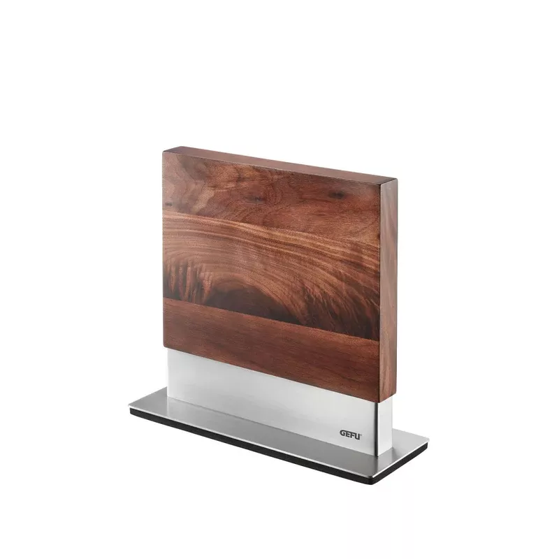 Fabriqué en bois de noyer de qualité supérieure, ce bloc massif attire tous les regards et utilise un système magnétique performant pour maintenir les couteaux en place des deux côtés.