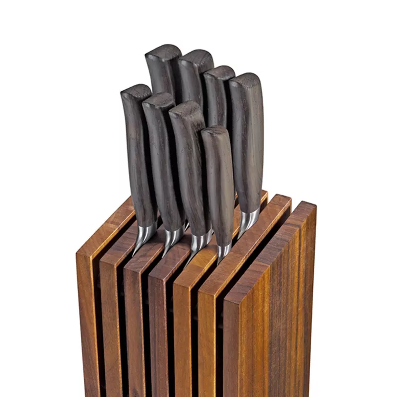 Jusqu’à 12 couteaux disparaissent élégamment dans les fentes du bloc compact. Des couteaux de cuisine aux couteaux à pain et aux couteaux à viande, les modèles avec une longueur de lame allant jusqu’à 25 cm peuvent être rangés en toute sécurité et de manière peu encombrante.