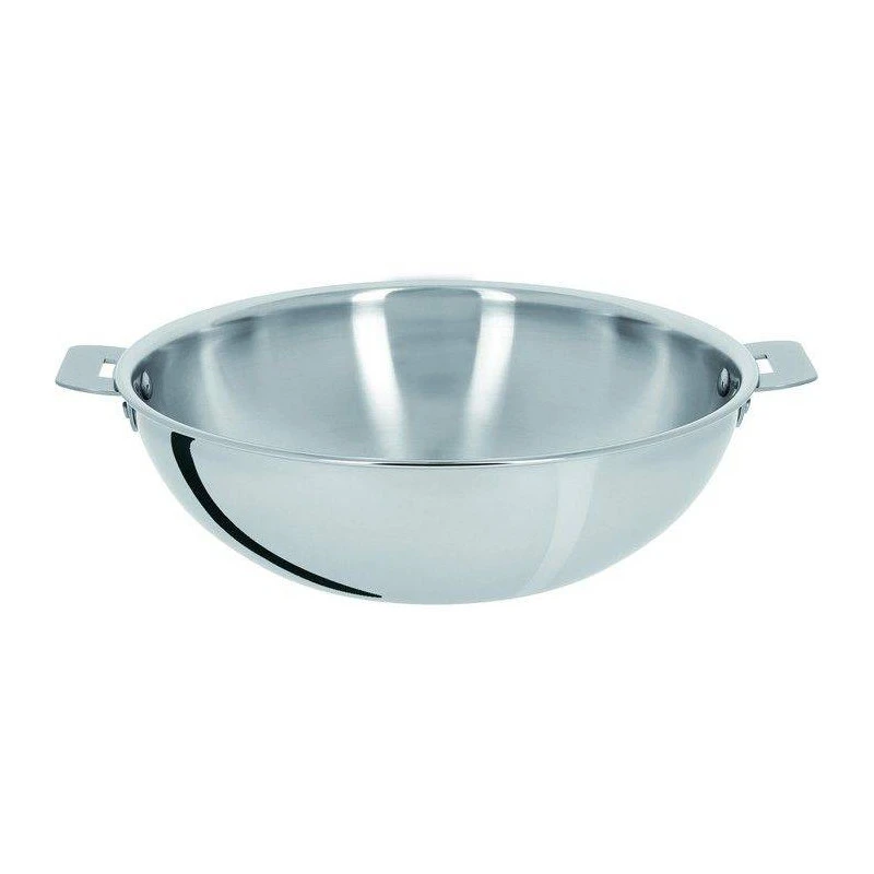 Wok inox finition brillant miroir en Multiply trilaminé, inox/ aluminium/ inox, à poignée amovible de la collection Casteline Amovible.