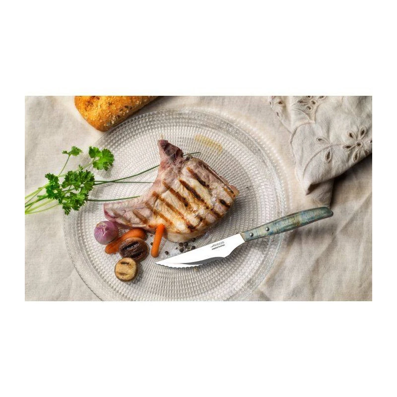 Le manche en bois compressé et riveté aux reflets bleutés permet une meilleure résistance aux effets du lave-vaisselle et offre un design original qui apportera une touche de couleur à votre table.