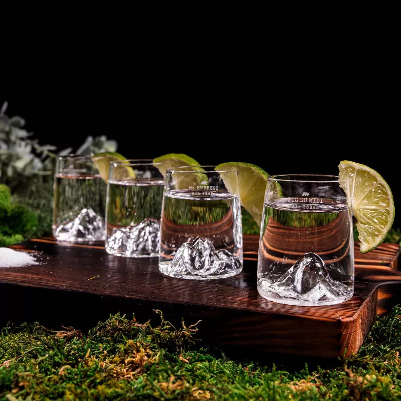 Chaque verre, fabriqué artisanalement, présente un design unique inspiré des reliefs naturels (Mont Blanc, Mont Cervin, Pic du Midi et Everest), apportant élégance et caractère à vos moments conviviaux.