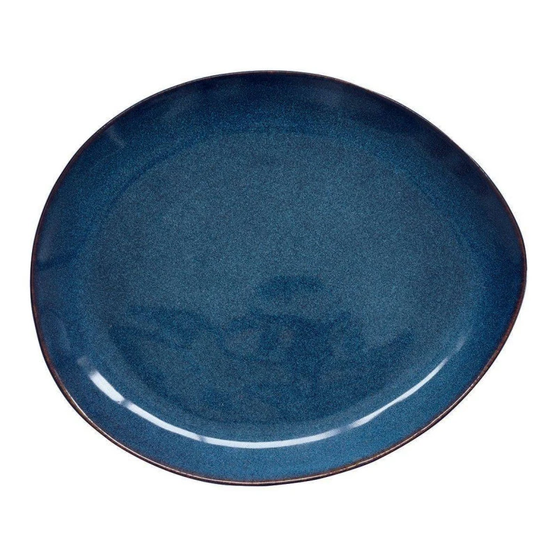 Assiette en grès coloré effet moucheté bleu ovale forme de galet