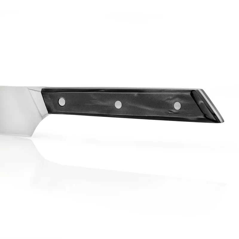 - Manche en méthacrylate noir nacré : Chaque manche présente des motifs uniques, rendant chaque couteau véritablement exclusif.