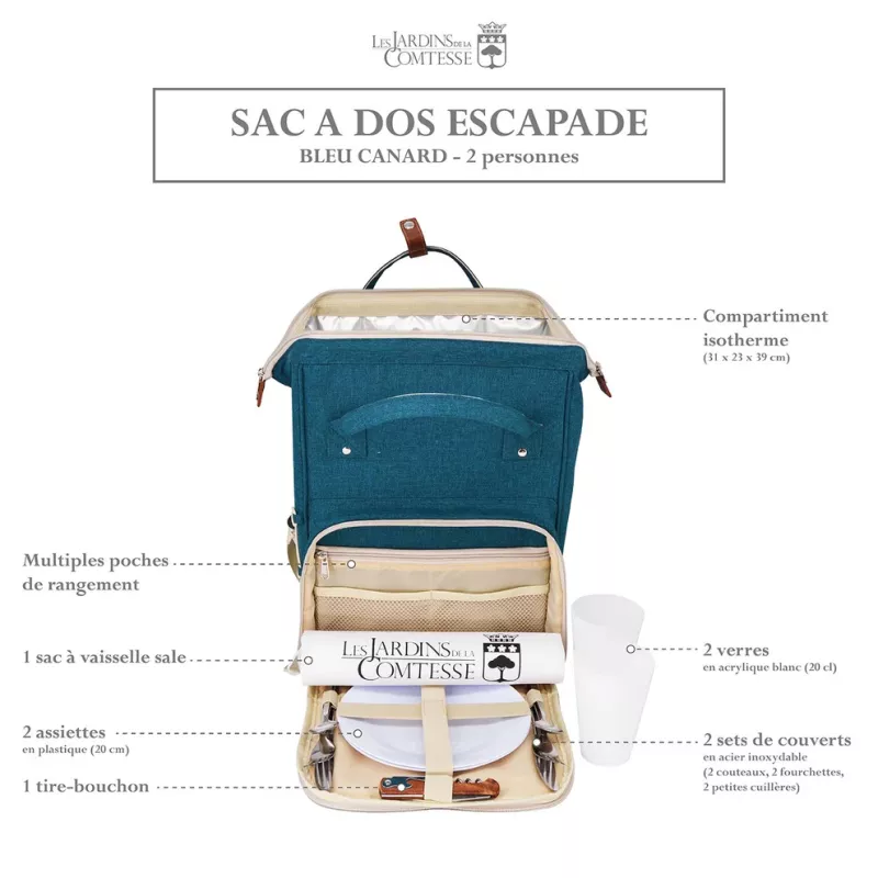 Ingénieux et pratique, équipé pour 2 personnes , voci le sac à dos pique-nique Escapade par Les Jardins de la Comtesse.