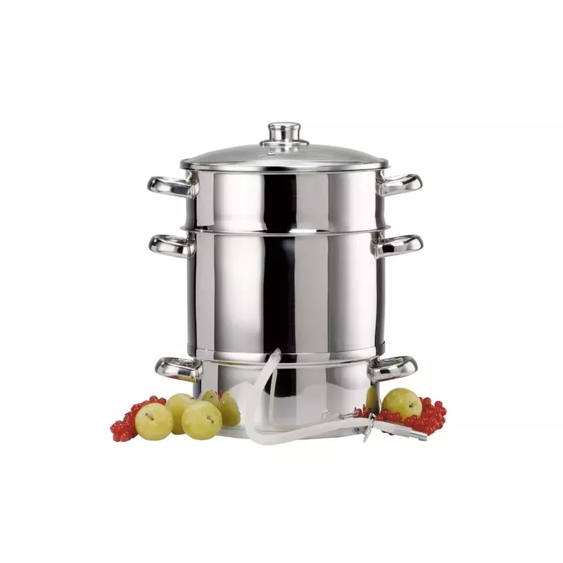 Remplissez le récipient inférieur d’eau, placez les fruits dans la passoire supérieure. La vapeur générée extrait le jus, qui s’écoule dans le faitout intermédiaire et peut être récupéré via le tuyau prévu à cet effet. Les bouteilles doivent être remplies immédiatement après l’extraction pour assurer une stérilisation efficace.