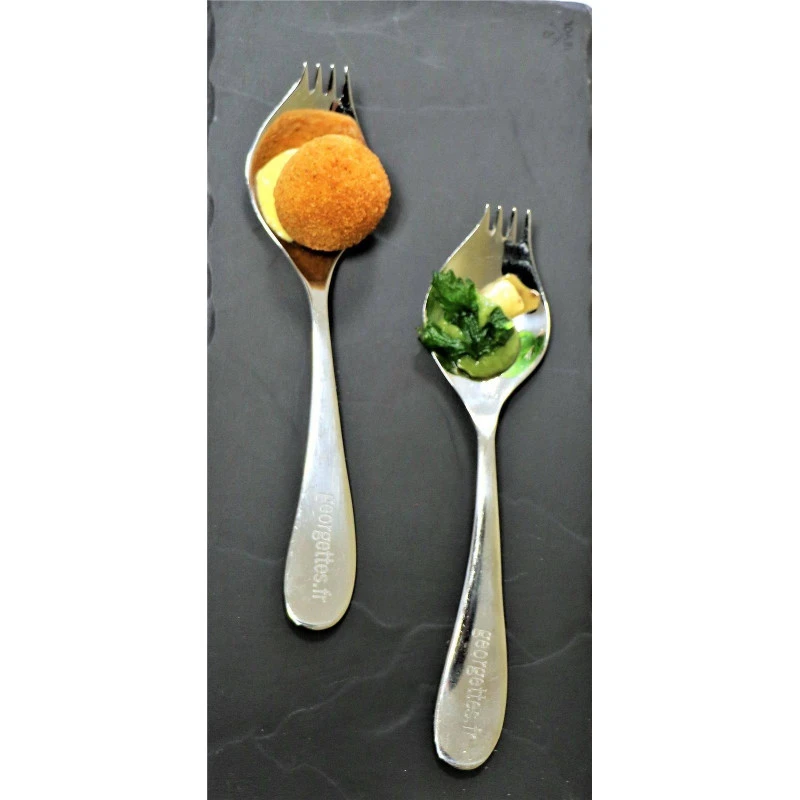 - Fourchette, cuillère et couteau à la fois, la GEORGETTE® est l’ustensile insolite et élégant, au service de l’amuse-bouche jusqu’au dessert.