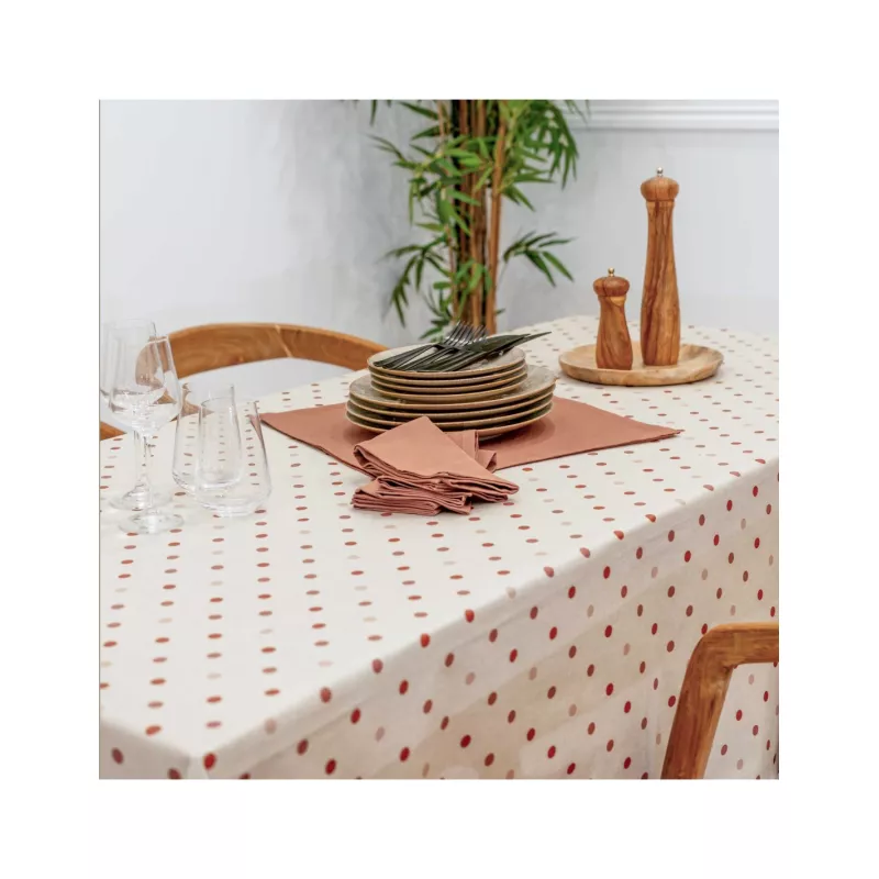 Découvrez la collection LORETTE, une nappe enduite de haute qualité garantissant une durabilité exceptionnelle, tout en apportant une touche lumineuse et colorée à votre table grâce à ses pois multicolores.