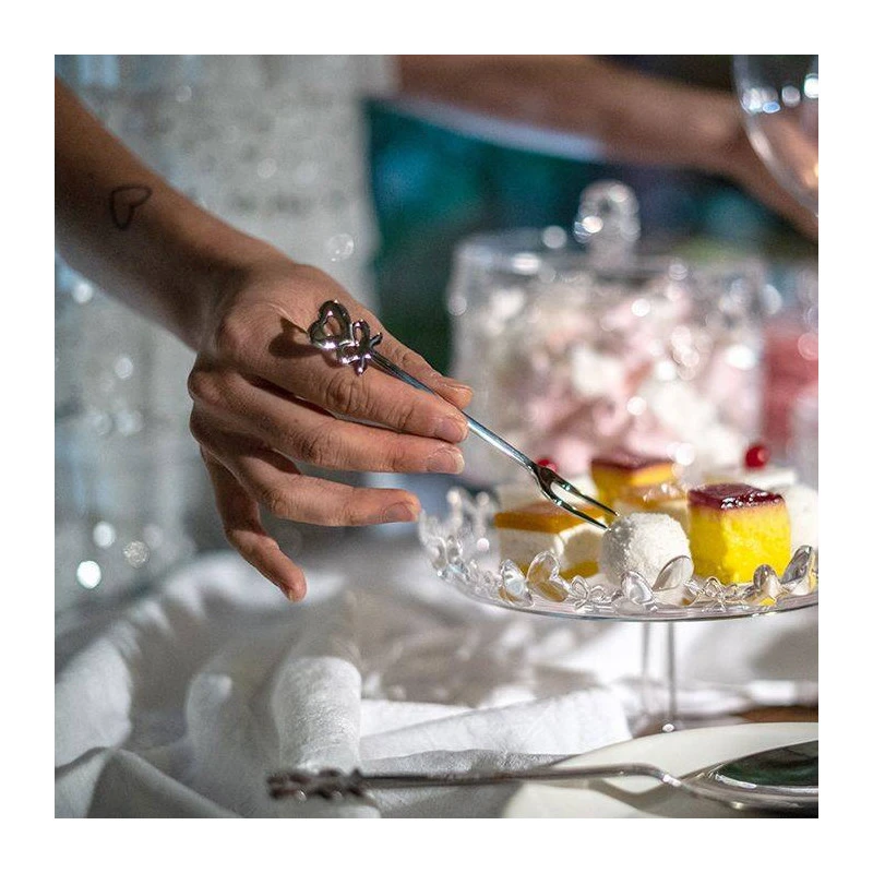 L’extrémité du manche est agrémenté d’une décoration romantique : noeuds d’amour, fleurs et petits coeurs au graphisme contemporain.