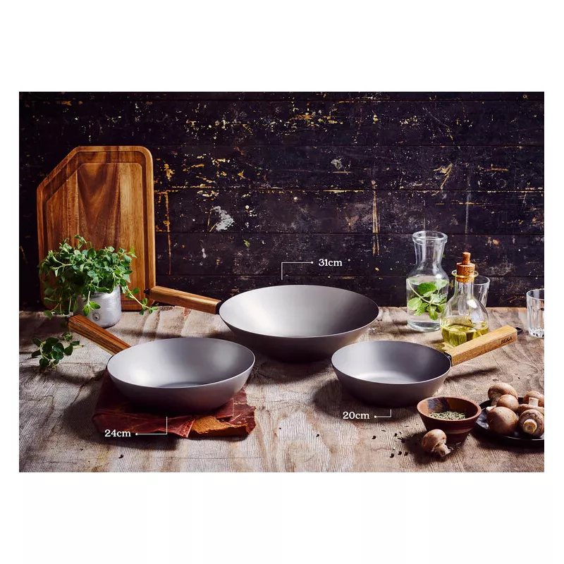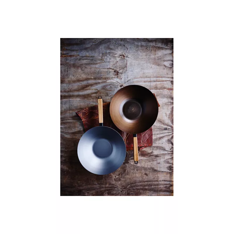 L’acier carbone est un excellent conducteur de chaleur, il est idĂ©al pour saisir vos viandes Ă haute tempĂ©rature, lĂ©gumes sautĂ©s…Â