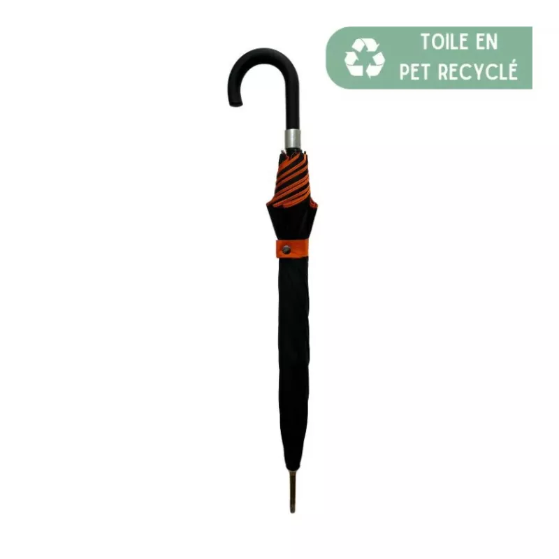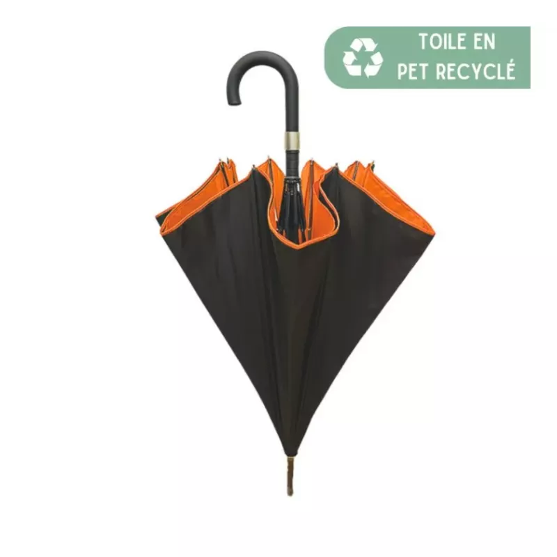 Ce grand parapluie Smati marie subtilement sobriété et modernité grâce à sa double toile noire extérieure et cognac intérieure, pour un look à la fois chic et original.