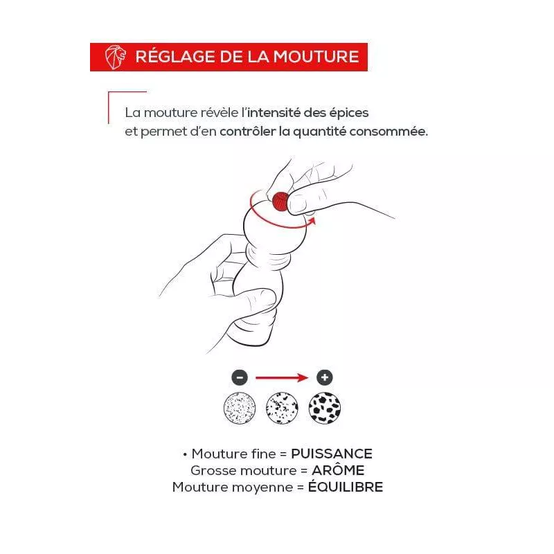 Pour un fonctionnement optimum du mécanisme, il est recommandé d’utiliser un poivre de diamètre inférieur ou égal à 6 mm