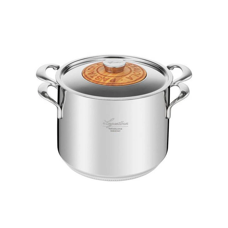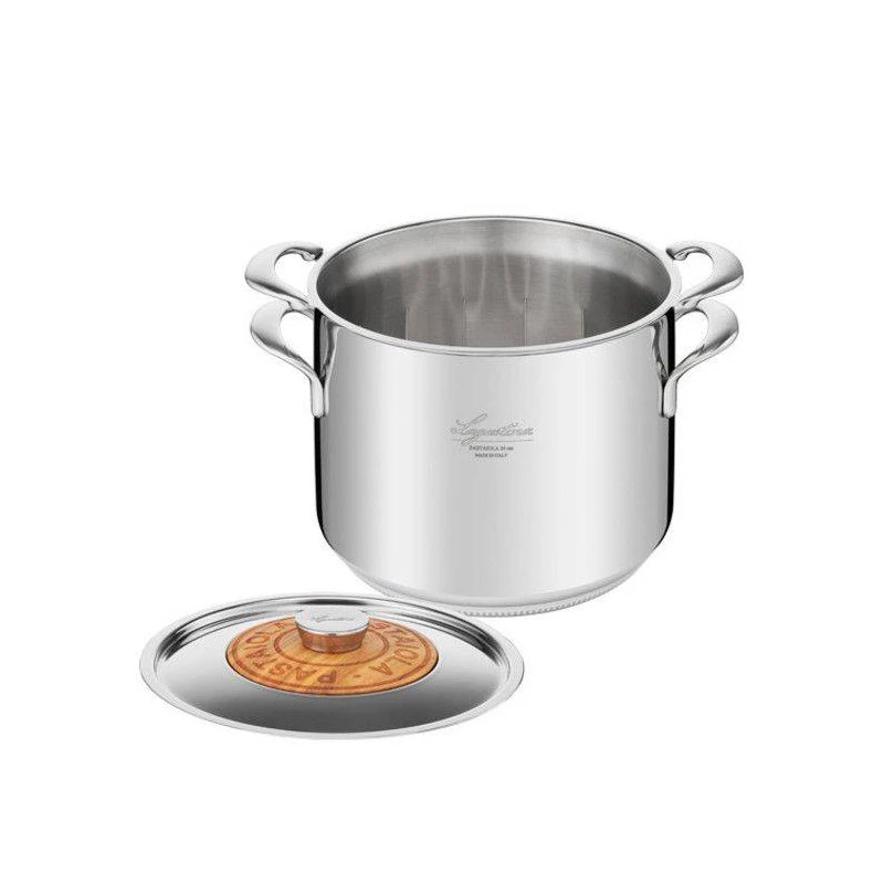 Panier Pasta breveté avec incisions verticales pour un égouttage rapide et sans effort. Niveaux d’eau marqués.