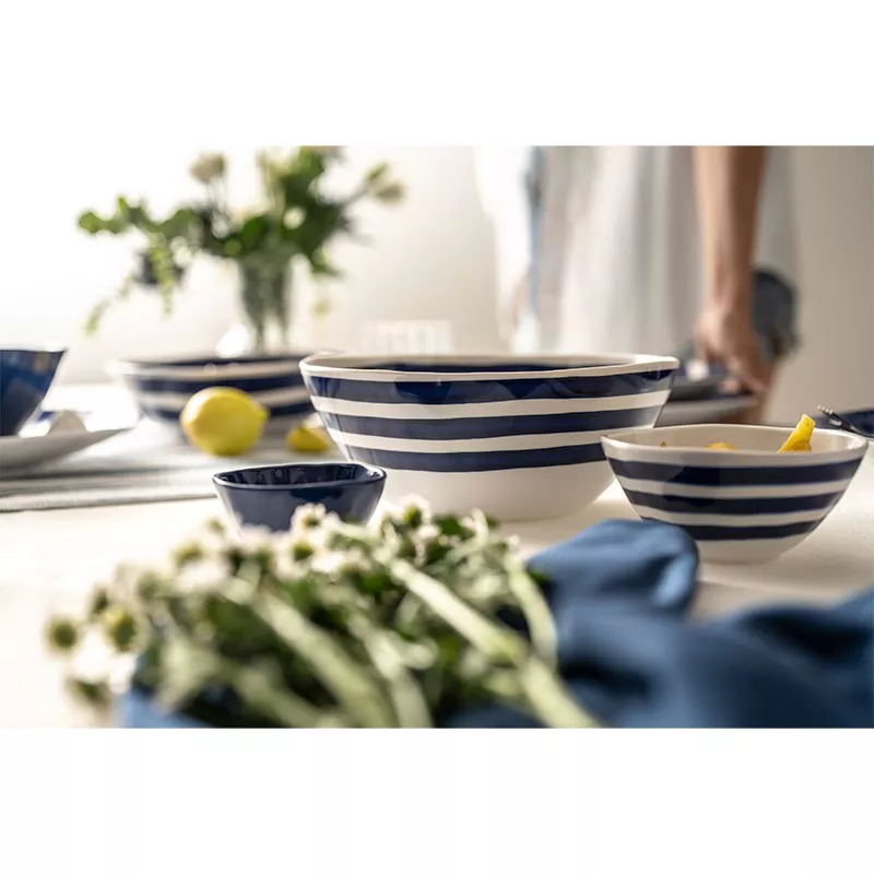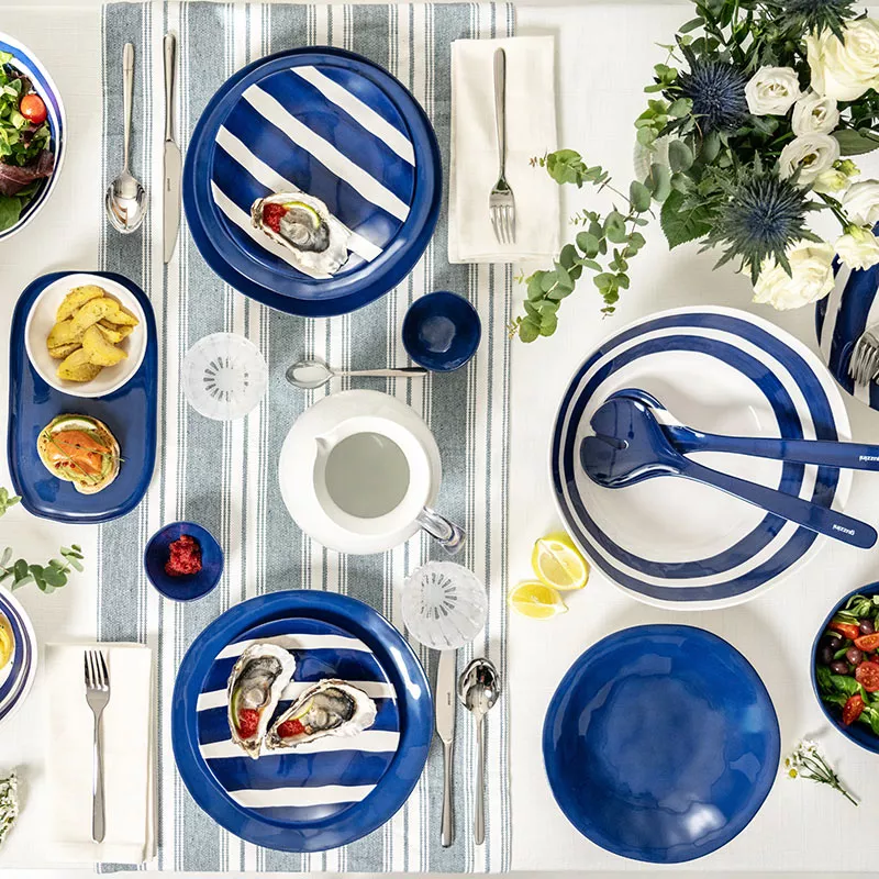 Les teintes bleues et blanches, associées aux formes irrégulières des plats, rappellent les vagues de l’océan et l’ambiance des bords de mer.
