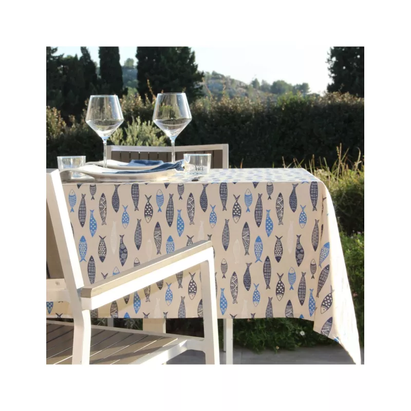 Apportez une ambiance estivale à votre table avec cette nappe enduite aux motifs sardines.