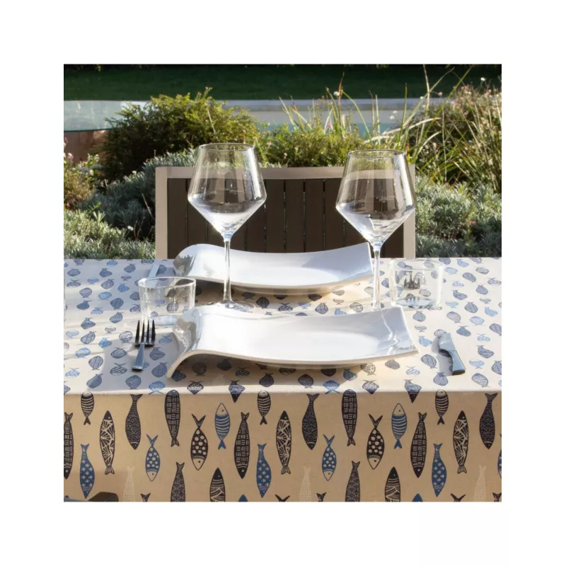 Apportez une ambiance estivale à votre table avec cette nappe enduite aux motifs sardines. Son tissu déperlant (70 % coton, 30 % polyester) bénéficie d’une double enduction, ce qui le rend résistant à l’eau et très facile d’entretien : un simple coup d’éponge suffit !