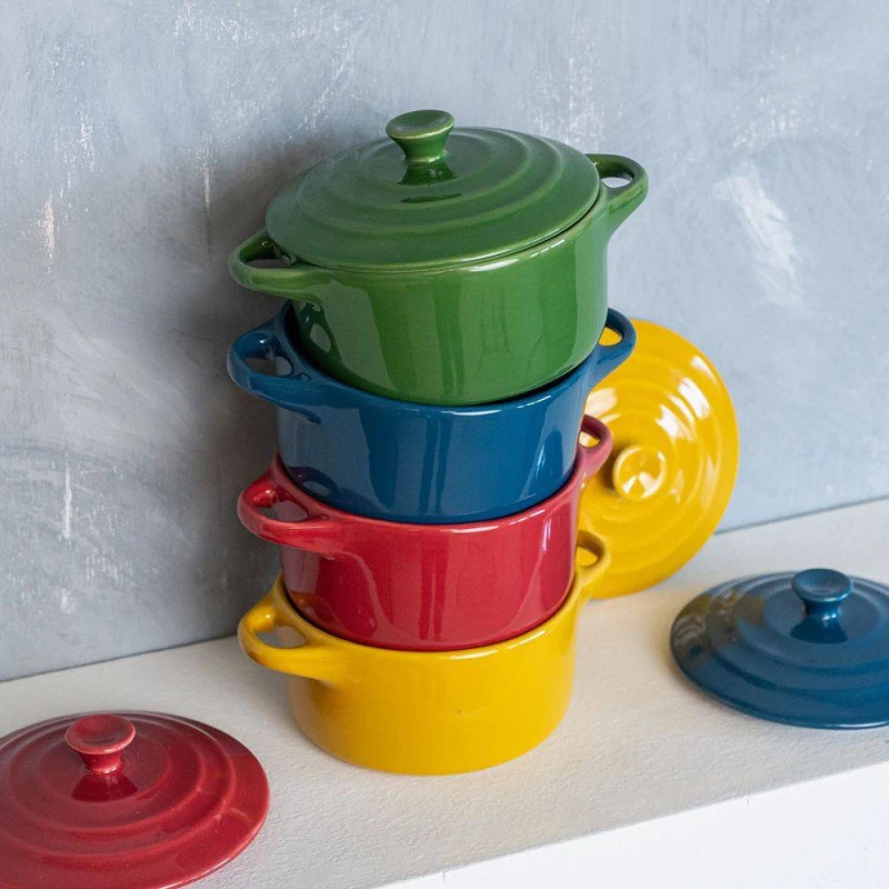 Ces mini cocottes en grÚs, de couleurs rouge, verte, bleue et jaune, vous permettent de présenter vos créations culinaires avec style et sobriété.