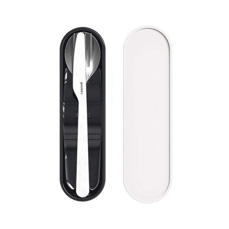 Couteau, Fourchette et cuillère en acier inoxydable rangés dans une boite en plastique.