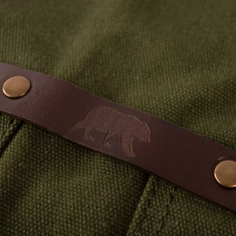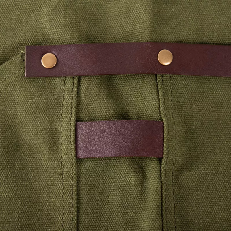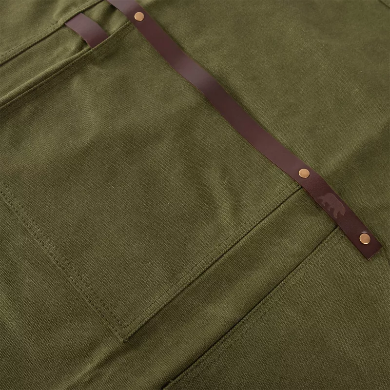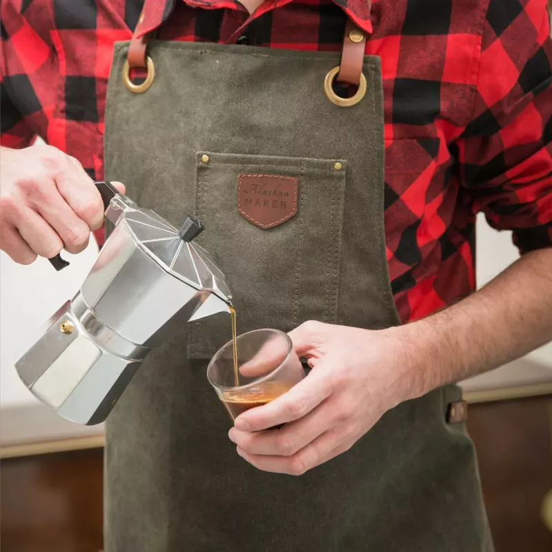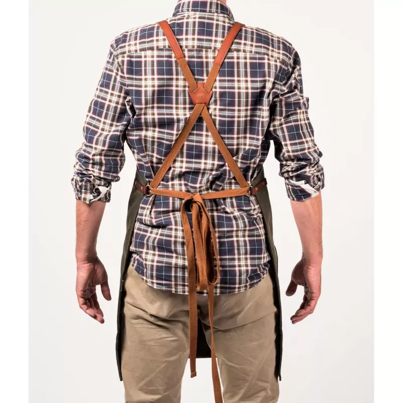 Le tablier en cuir et toile waxée N°547 d’Alaskan Maker combine à la perfection praticité et robustesse.